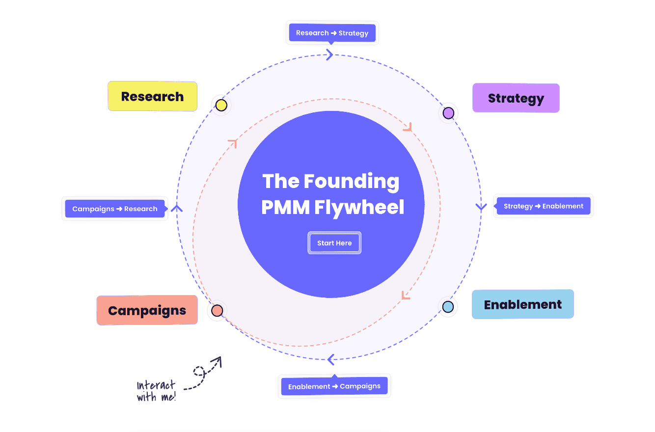 If you’re a seasoned PMM, you know that Enablement is one of the 4 core pillars of product marketing. Take a look at the Founding PMM Flywheel shown below: