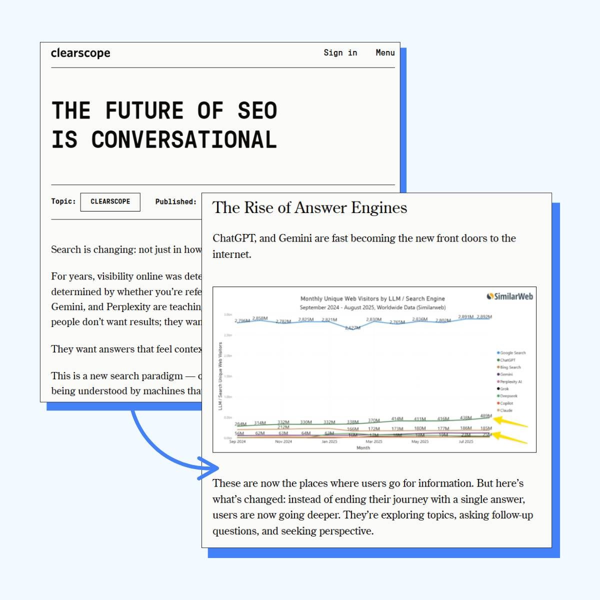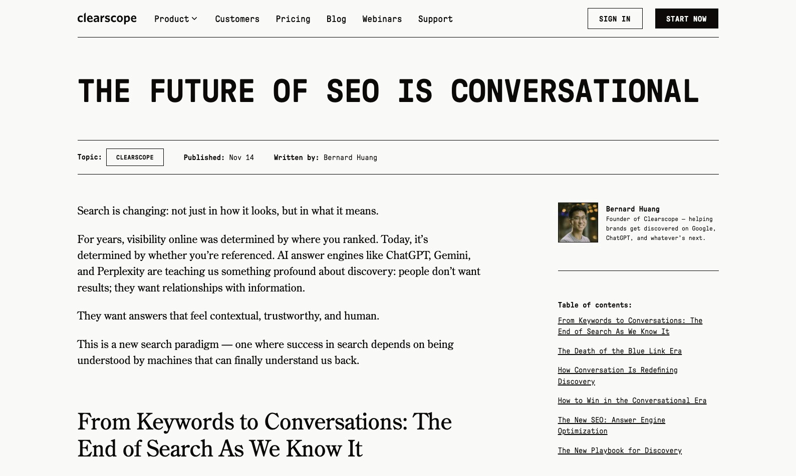 This is a great example of content that plants a flag and helps buyers choose who to work with. ClearScope’s “The Future of SEO Is Conversational” blog doesn't just push a clear POV on where search is going. It also shows exactly where ClearScope fits. This kind of content does more than differentiate. It sets a clear direction. Buyers leave with a sense of what you believe, where you’re headed, and what your roadmap likely prioritizes. If you have a POV, this is a great way to bring it to life.
