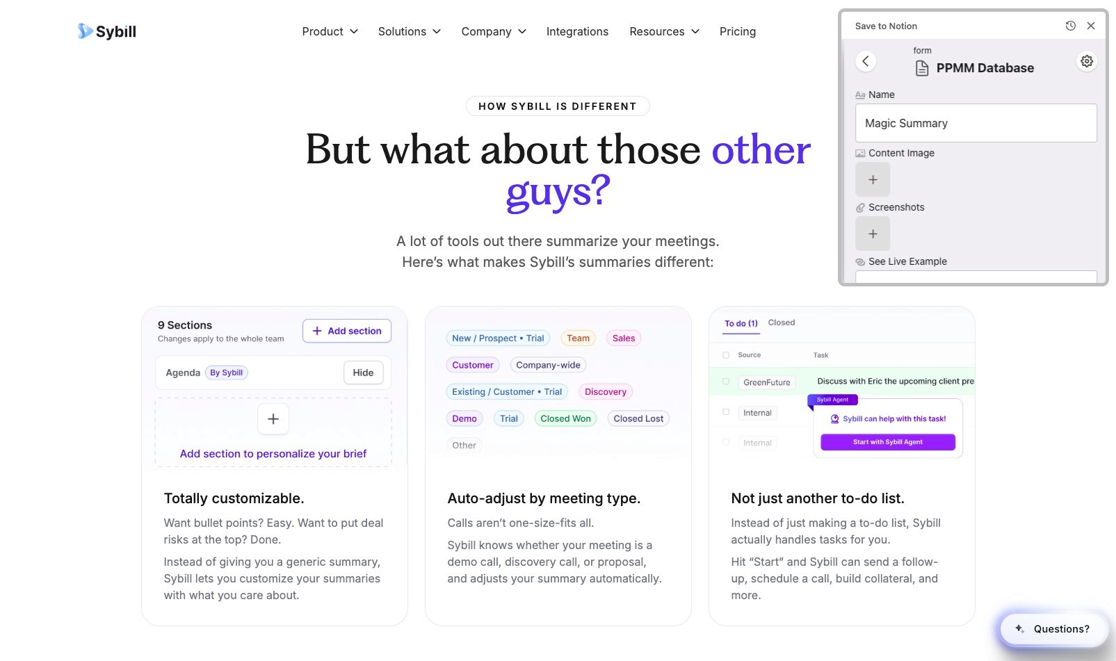 This section on Sybil's website does a great job highlighting how one specific feature, Summaries, is different from other competitors. They address comparisons head-on saying: “But what about the other guys?”