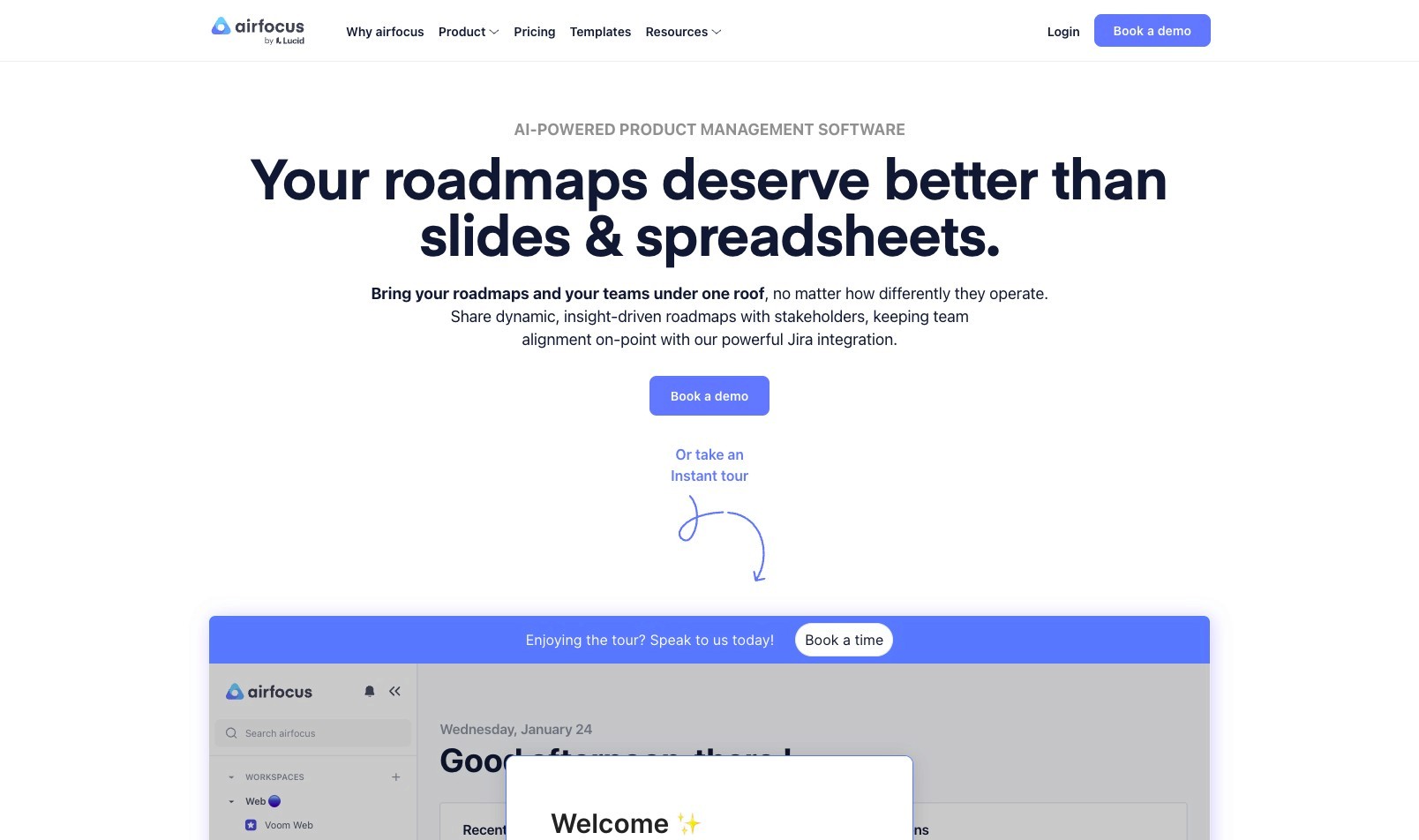 Airfocus has two options on their page: "Book a demo" or "Take an instant tour." Pretty standard stuff, right?