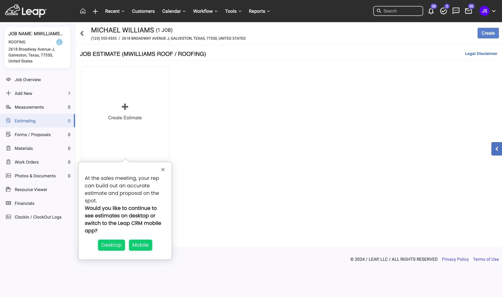 Midway through, they set the stage: "At the sales meeting, your rep can build out an accurate estimate and proposal on the spot." Then they ask: desktop or mobile?