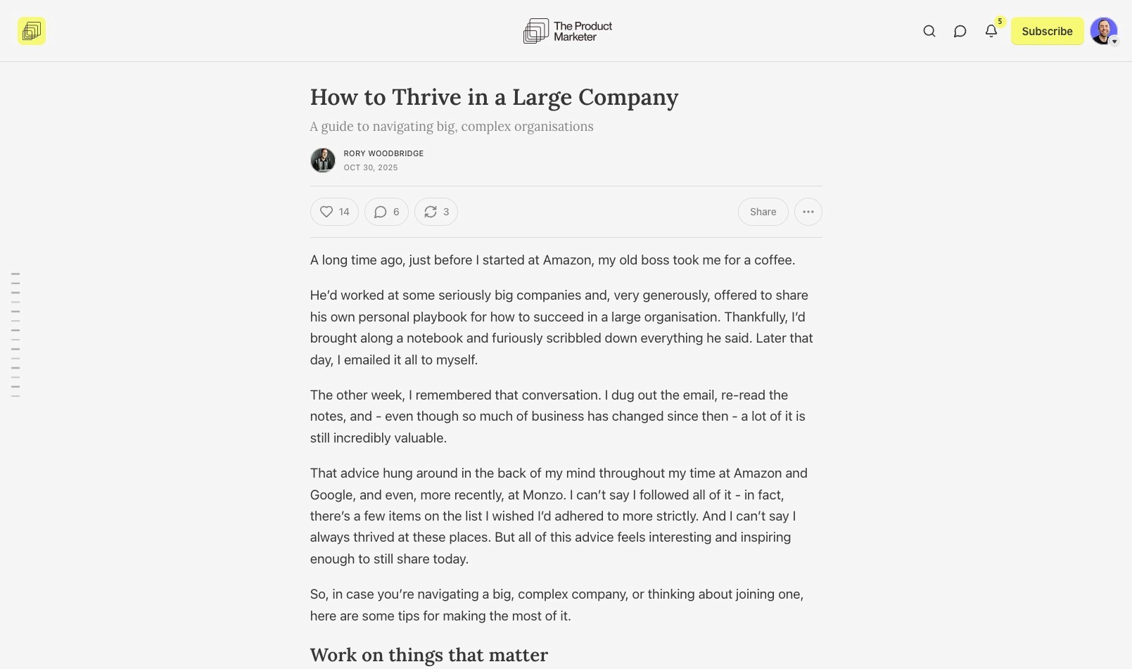 Survival guide for big orgs - Rory Woodbridge shares a tactical guide for how to thrive as a PMM at big orgs.