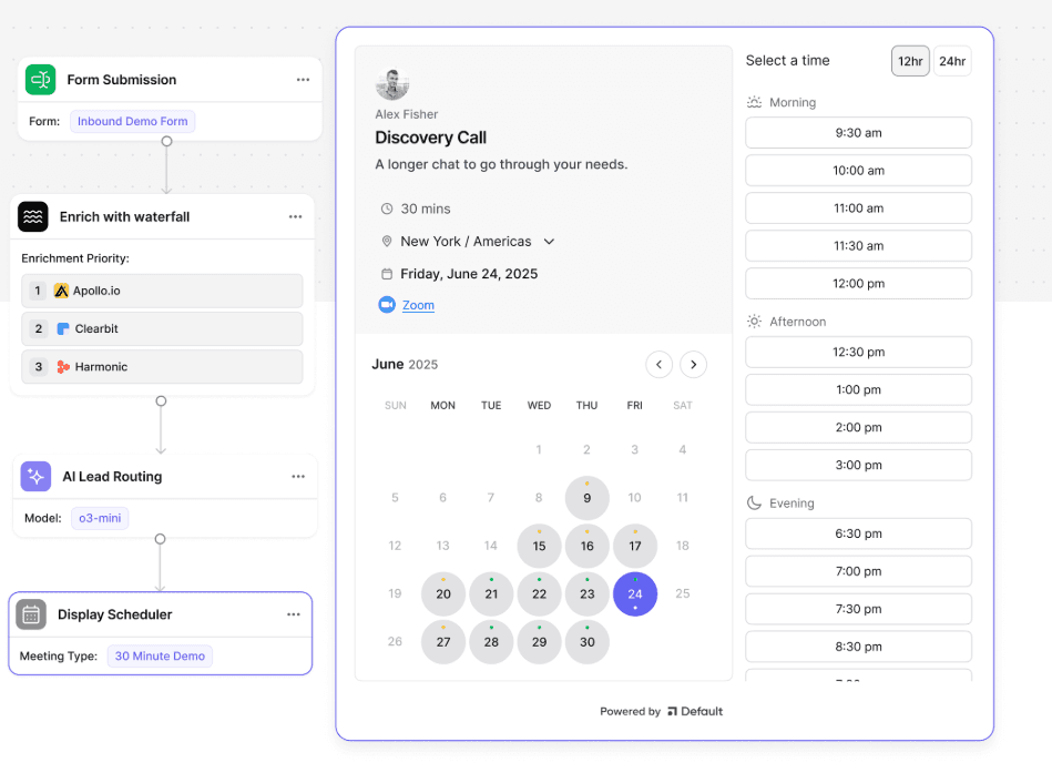 Default nails the sweet spot between a hero image and a how-it-works section. One graphic shows exactly what their inbound scheduling tool does and what’s happening behind the scenes. The top-level promise is simple: turn qualified inbound leads into booked meetings. The visual breaks down the machinery that makes it happen. A perfect image for products where a lot of the magic happens in the background.