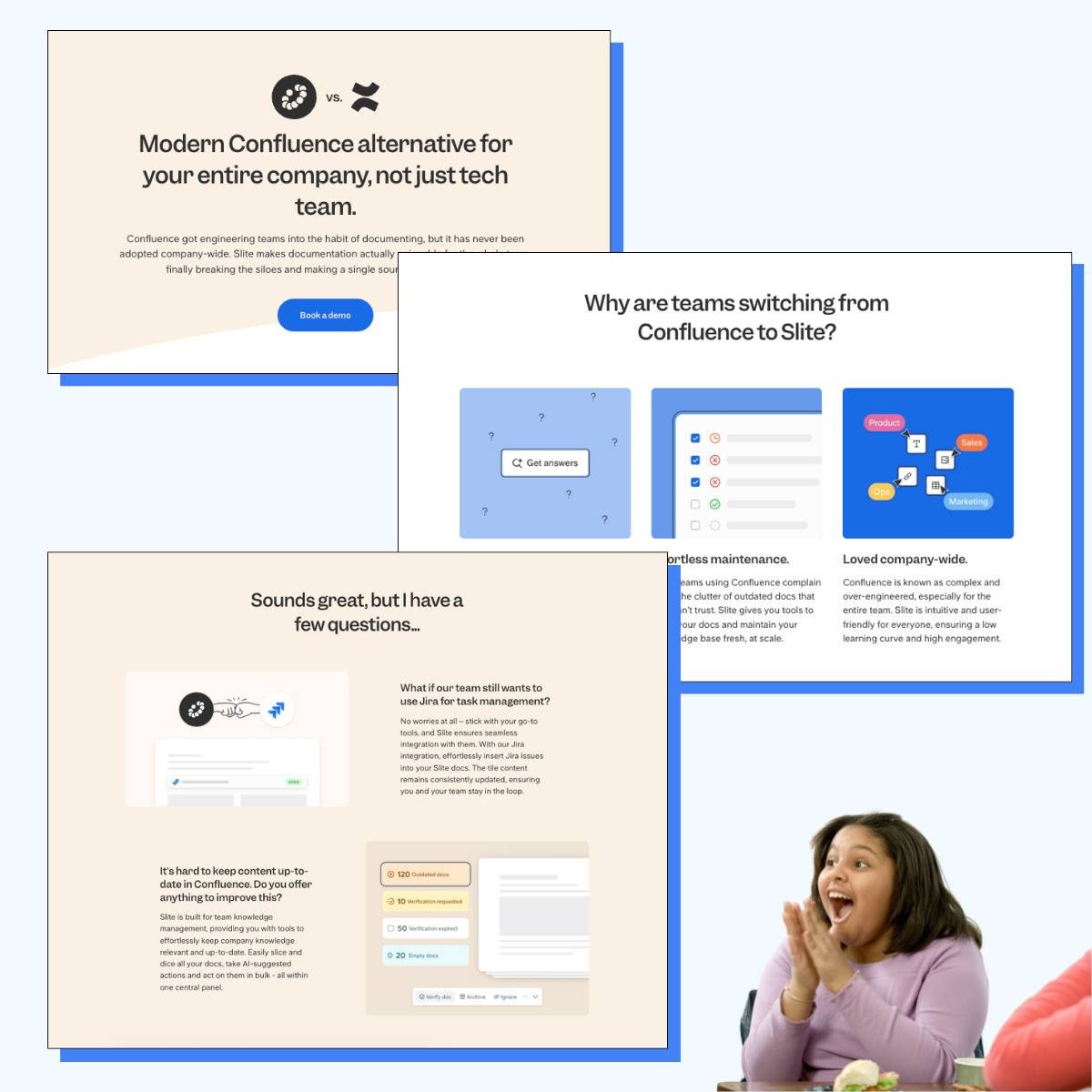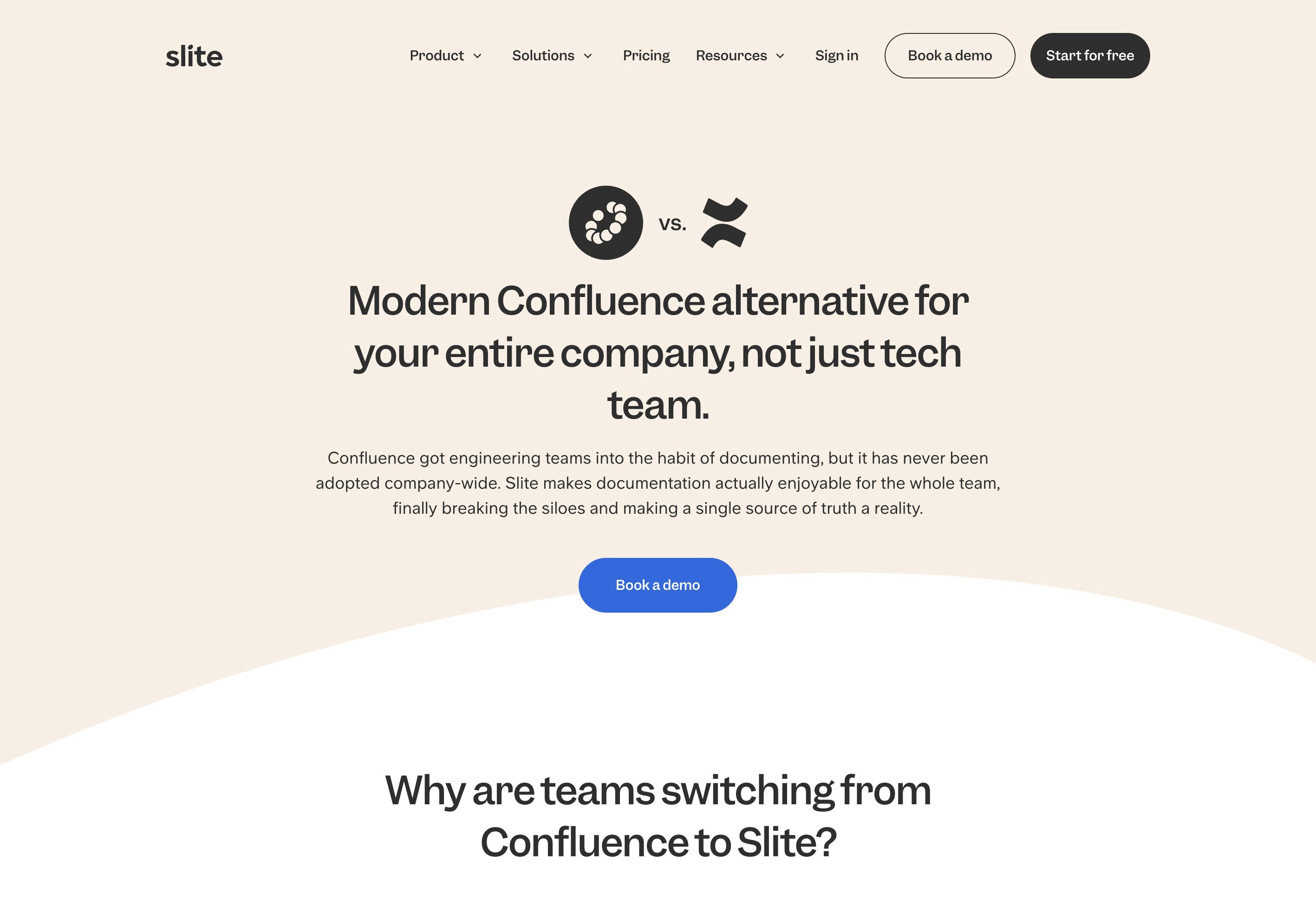 Most comparison pages lean on long tables that don’t actually help anyone make a decision. Not Slite. They open with the single most important reason to switch from Confluence and spend the rest of the page backing it up. Add in a smart set of objection-handling questions and strong social proof, and you end up with a page that actually helps buyers choose with confidence.