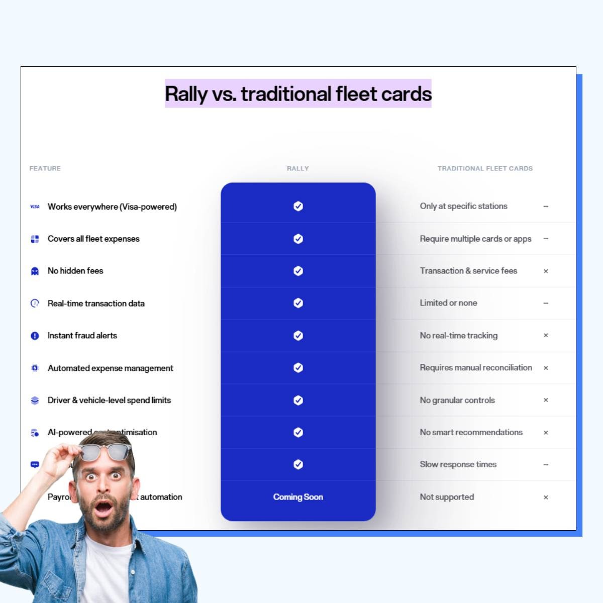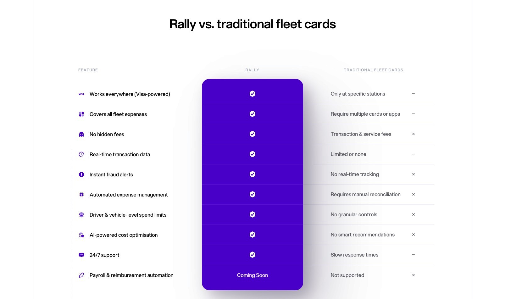 Most comparison checklists are bloated and unreadable. Rally keeps theirs short and useful. Instead of naming competitors, they compare against the status quo: traditional fleet cards. That makes it a simple buyer enablement tool, not a feature bake-off. It’s easy to scan, written in plain language, and goes straight to what buyers care about.